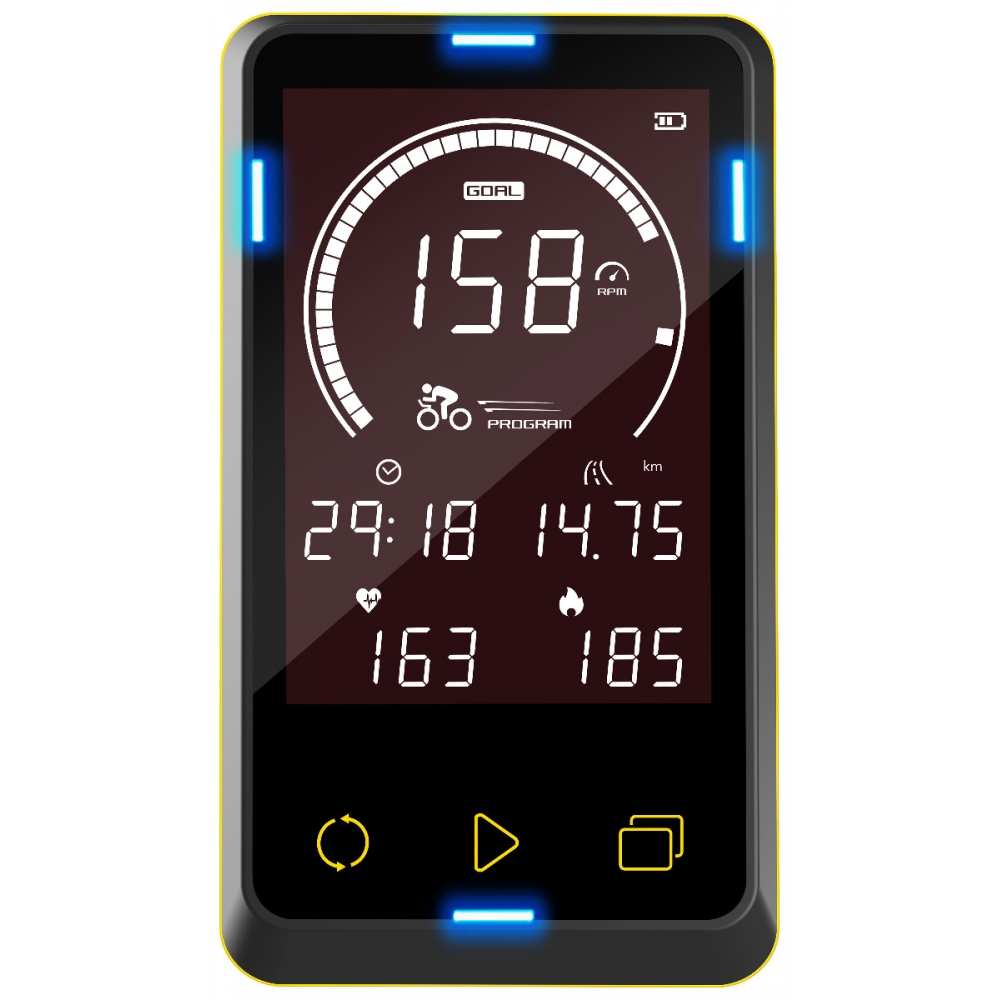A elegante consola LCD de 5" apresenta o tempo, a distância, as calorias, a frequência cardíaca, as RPM, a velocidade e o nível da bateria. Inclui 3 programas de treino diferentes: treino HIIT, intervalos de velocidade e intervalos de frequência cardíaca. É, além disso, compatível com a tecnologia de frequência cardíaca sem fios da Polar. O sistema Glow Ride: os indicadores luminosos funcionam como um treinador virtual para te mostrar as três posições corporais que deves adotar em cada etapa do teu treino, mantendo-te focado no exercício.| Monitor | |